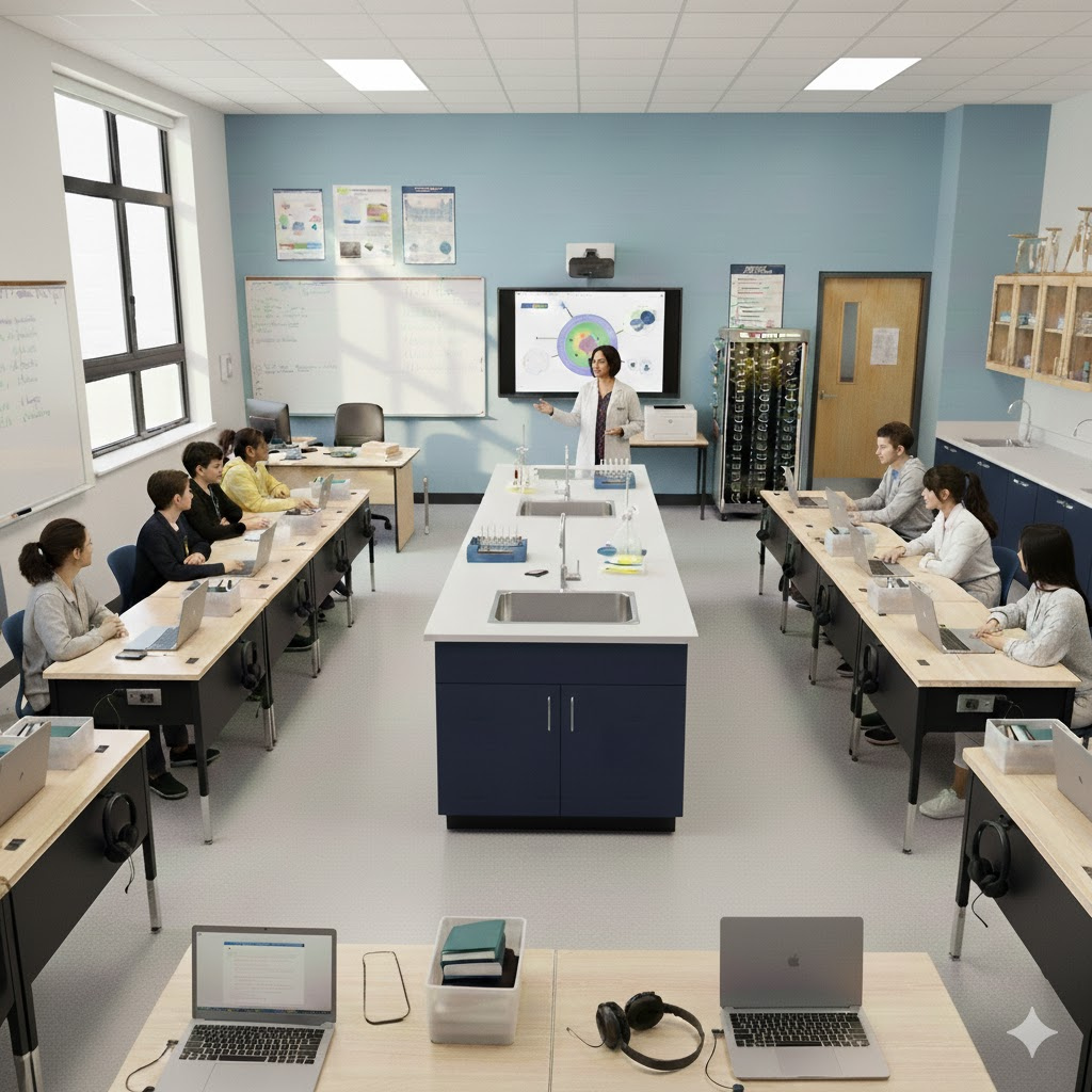 | ✔Student Chromebooks ✔ Teacher workstation ✔ Smartboard & projector ✔ Charging cart ✔ Document camera ✔ Headsets & keyboards/mice ✔ Assistive technology ✔ Printer/scanner ✔ Wi-Fi and networking gear ✔ Optional IoT & AR devices | ✔ Google Workspace ✔ LMS (Canvas/Google Classroom) ✔ Device management tools ✔ Discovery Education ✔ IXL ✔ TestNav access ✔ Interactive game tools (Kahoot, Nearpod, Quizizz) ✔ Simulations (PhET, Gizmos) ✔ IoT dashboards and accessibility software |